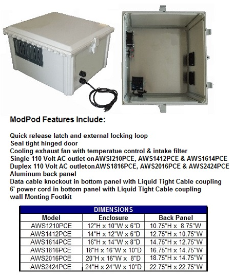 The ModPod Polycarbonate Enclosure with Cooling fan and AC outlet by Applied Wireless Solution is a weatherproof enclosure ideal for devices such as a POE Switch, Wireless Access Point, or Cell Modem