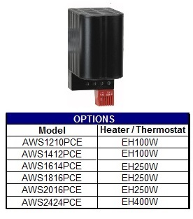 Heater provide evenly distributed interior air temperature and prevent the formation of condensation in the enclosure. Heater is equipped with a fixed set point thermostat, touch-safe PTC resistor heating element and 120 VAC operating